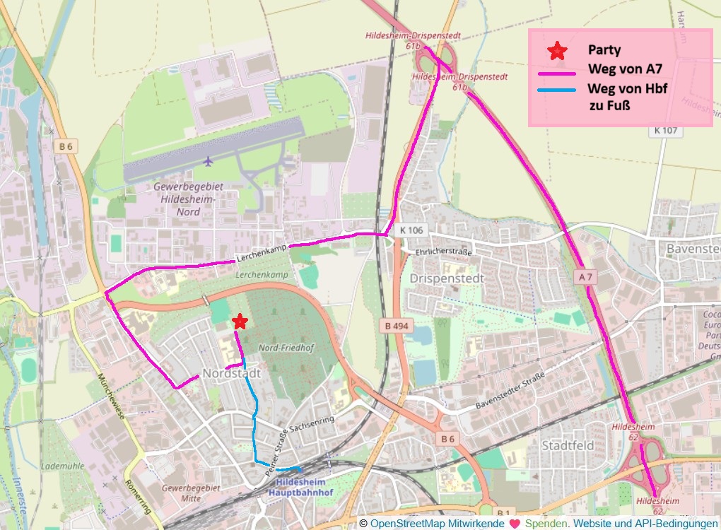 Zurzeit (Stand: Februar 2026) ist die Ausfahrt 62 von Süden kommend in Richtung Hildesheim gesperrt. Ihr fahrt dann bis zur Ausfahrt 61b Drispenstedt und folgt der B494 bis zur ersten Abfahrt nach der Aral-Tankstelle (links). Ihr fahrt auf den Lerchenkamp und bis zu einer großen Kreuzung, an der die B6 quer verläuft. Biegt hier links auf die B6 ab und fahrt geradeaus weiter. Sobald ihr auf der rechten Straßenseite eine Esso-Tankstelle seht, biegt links in die Richthofenstraße ab und fahrt bis zum Ende. Direkt hinter der Robert-Bosch-Gesamtschule befindet sich ein kleiner geteerter Fahrweg, der hinter die Schule führt.