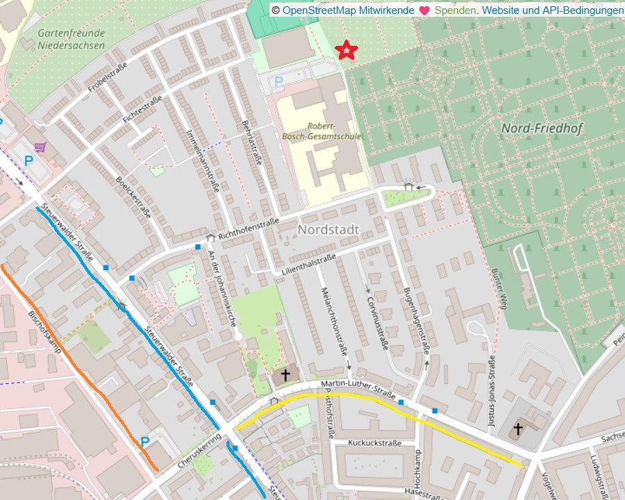 Am Ziel angekommen, befindet sich ein Parkplatz. Falls dort kein Platz ist, findet ihr in den umliegenden Straßen oder in etwa 10 Minuten Fußweg Entfernung in den Straßen Steuerwalderstraße (blau), Bischofskamp (orange) oder Martin-Luther-Straße (gelb) Parkplätze.